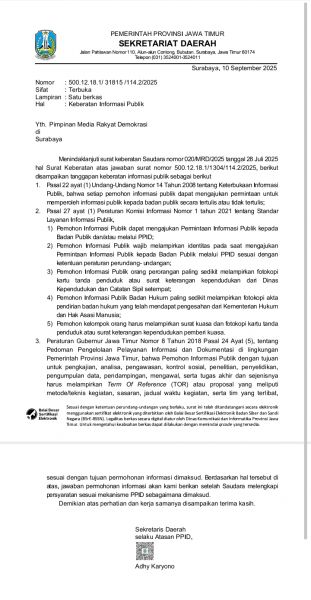 Sebagai tambahan informasi, Pemerintah Provinsi Jawa Timur melalui Sekertaris Daerah telah memberikan jawaban terkait surat keberatan yang diajukan oleh Media Rakyat Demokrasi atas permohonan informasi lanjutan atas dugaan penyalagunaan wewenang penggunaan APBD pada program OPOP Periode 2020-2024.